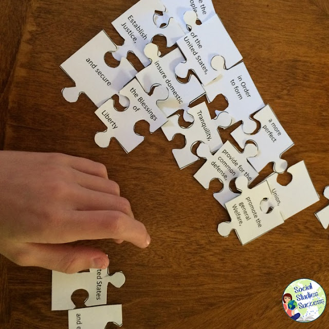 You don’t often see puzzles in Social Studies – but you can include them when you are asking your students to memorize a text. The Preamble to the Constitution or the Declaration of Independence are excellent sources of text to use for a puzzle. Simply have the students solve the puzzle as they recite the text over and over again.